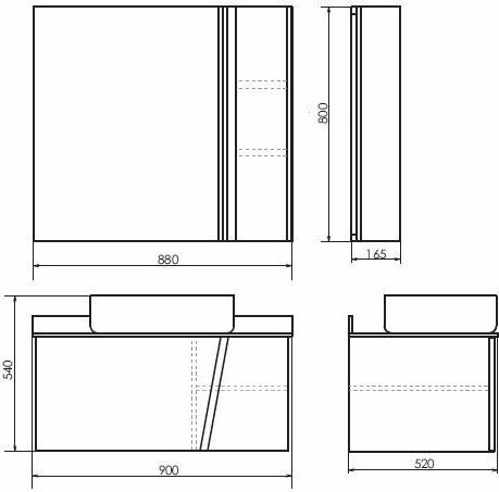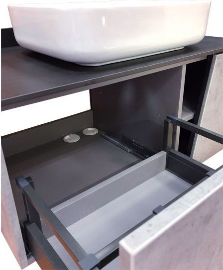 Тумба оборудована большим выкатным ящиком и дополнительной боковой нишей. Пространство внутри ящика разделено специальным органайзером. За боковой створкой одна горизонтальная полка. Фасад ящика оборудован системой Push-to-Open (открытие при нажатии), у боковой створки петля с механизмами плавного закрывания.