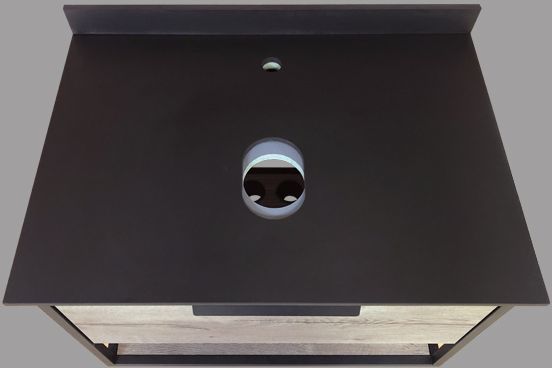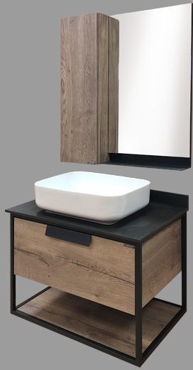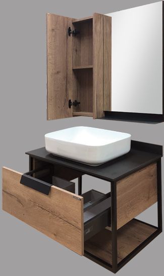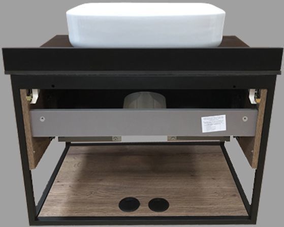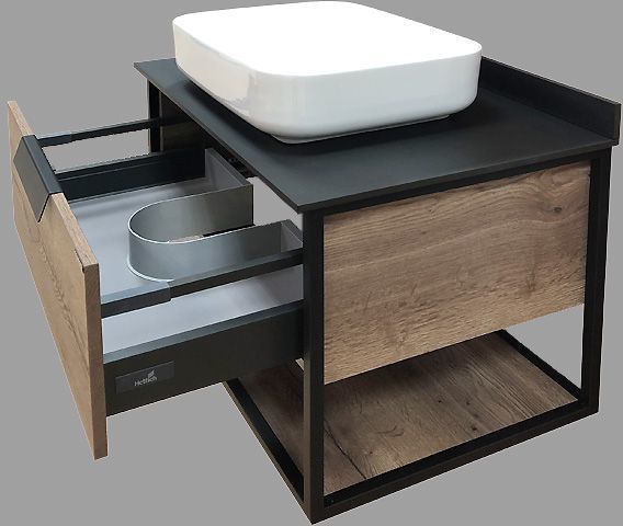 Подвесная тумба-умывальник с одним выкатным ящиком оснащенным системой плавного закрывания и нижней полкой открытого хранения. В основе тумбы - каркас из стального профиля окрашенный черной матовой эмалью.