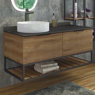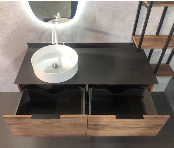 Тумба подвесная Comforty Порто 120 см с раковиной Comforty 9110, столешница и плинтус из черного керамогранита, цвет дуб тёмно-коричневый.