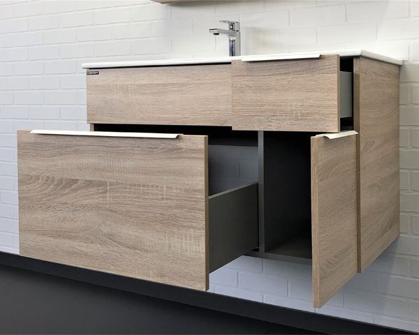 - Подвесная тумба с одним большим, одним малым выкатными ящиками и малой створкой оборудованными системами плавного закрывания. Корпус и фасад тумбы изготовлены из влагостойкого ДСП, созданного по уникальной технологии «Синхронное тиснение» в декоре «дуб сонома». Этот декор при прикосновении дарит ощущение натуральной древесины. Ручки тумбы из стального профиля окрашенного в белый цвет. Тумба подготовлена для подключения водоснабжения снизу.