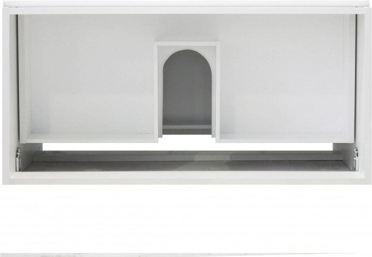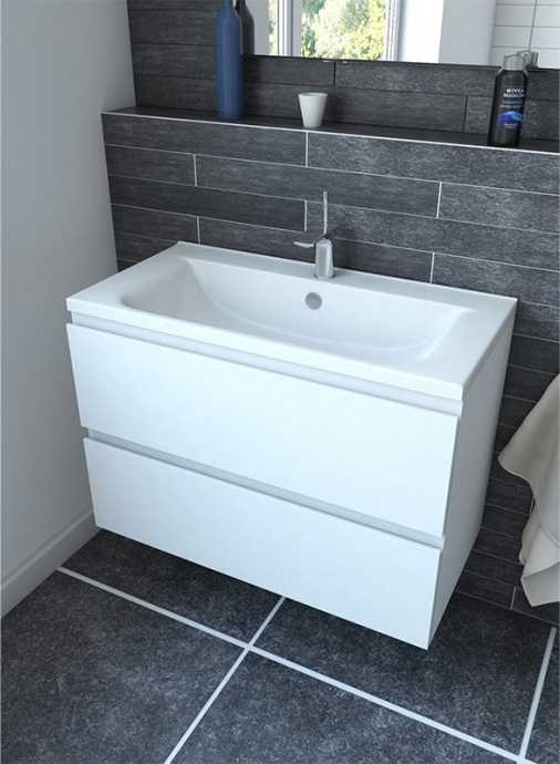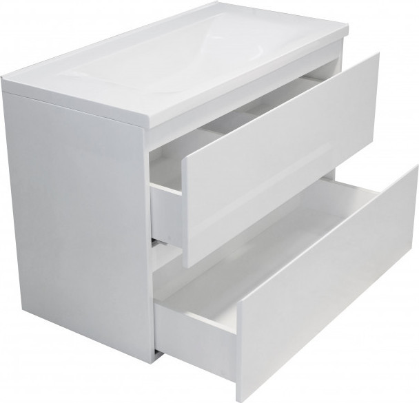 - Четкие геометрические формы, бесшумное закрывание ящиков, вместительная тумба с верхним и нижним ящиками создает дополнительное пространство, где будут надежно скрыты от влаги банные принадлежности.