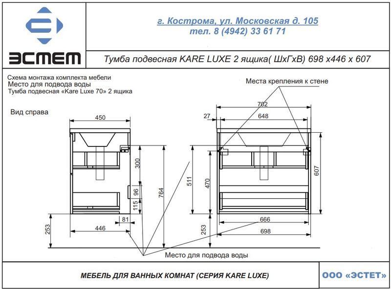Тумба подвесная с раковиной Эстет Kare Luxe 70 см (2 ящика) ФР-00007073
