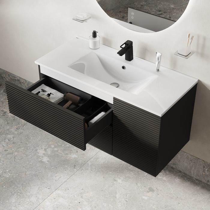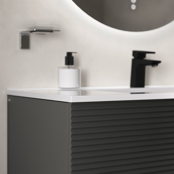 Вместительная подвесная тумба для ванной комнаты Bild с умывальником и выдвижными ящиками и полками – красивый дизайн с трендовой горизонтальной фрезеровкой в сочетании с популярным темно-серым цветом, удобством и практичностью. Материал фасадов – МДФ с покрытием ПВХ-пленкой. Она разработана для использования в помещениях с высокой влажностью и сохранит первоначальный вид мебели надолго (при должном уходе). Материал боковин – МДФ. Керамический умывальник с высоким бортом и большой вместительной чашей в комплекте. Удобен для гигиенических и хозяйственных нужд. Два ящика с направляющими скрытого монтажа с доводчиком Hettich и полки с распашной дверкой. Фурнитура рассчитана на более 10 лет исправной работы. Современный механизм открытия Push-to-Open – открывается нажатием на фасад. В комплекте крепеж для монтажа тумбы. Сифон приобретается отдельно. Гарантия на мебель IDDIS® – 3 года, на умывальник – 5 лет.