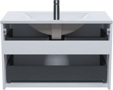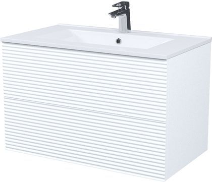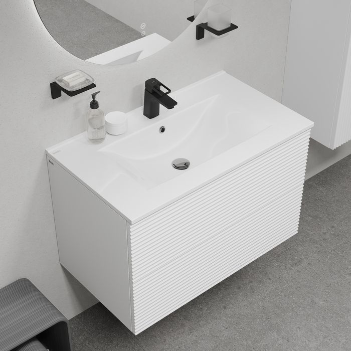 - Вместительная подвесная тумба для ванной комнаты Bild с умывальником и выдвижными ящиками – красивый дизайн с трендовой горизонтальной фрезеровкой в сочетании с универсальным белым цветом, удобством и практичностью.