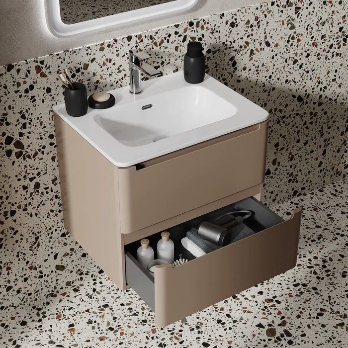 - Компактная подвесная тумба с плоским умывальником Edifice в теплом оттенке капучино – воплощение современного минимализма. Мягкие линии корпуса в сочетании с удобными интегрированными ручками выглядят свежо и актуально. Смотрится аккуратно, легко и не усложняет процесс уборки в ванной благодаря подвесной конструкции.
