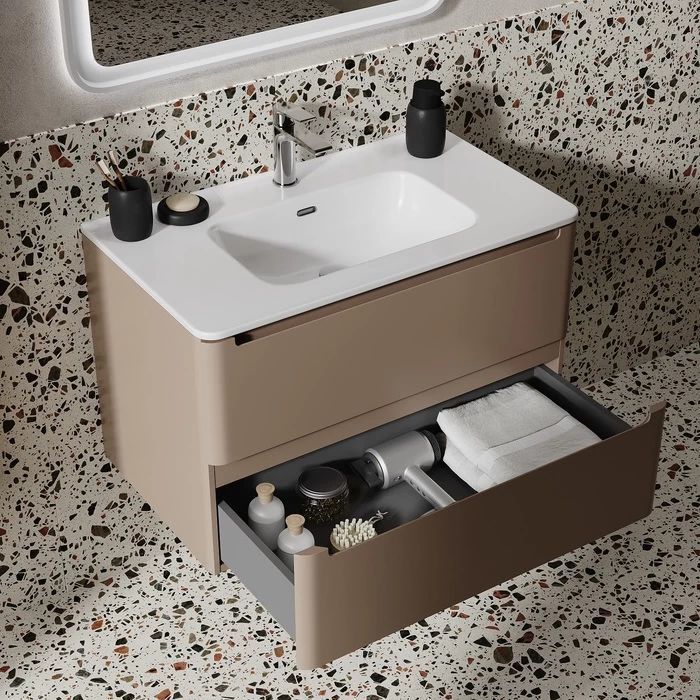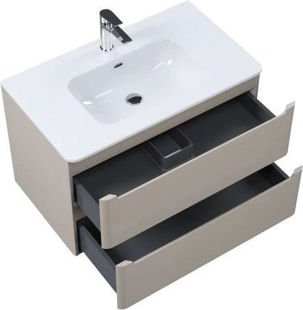 - Подвесная тумба с плоским умывальником Edifice в теплом оттенке капучино – воплощение современного минимализма. Мягкие линии корпуса в сочетании с удобными интегрированными ручками выглядят свежо и актуально. Смотрится аккуратно, легко и не усложняет процесс уборки в ванной благодаря подвесной конструкции.