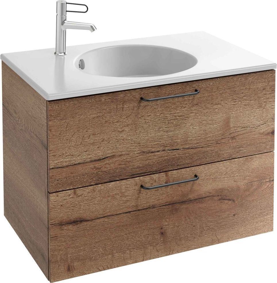 Тумба подвесная Jacob Delafon Odeon Rive Gauche 80 см EB2522-R9-E52 с раковиной Odeon Rive Gauche 81 EXAW112-Z-00, 2 выдвижных ящика с механизмом «плавное закрывание», цвет дуб табак, ручки - черные.