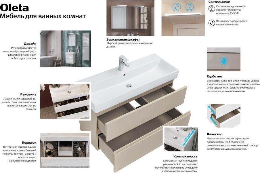 - Модуль с раковиной глубиной 390 мм позволяет использовать мебель Oleta даже в небольших ванных комнатах