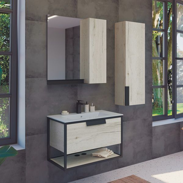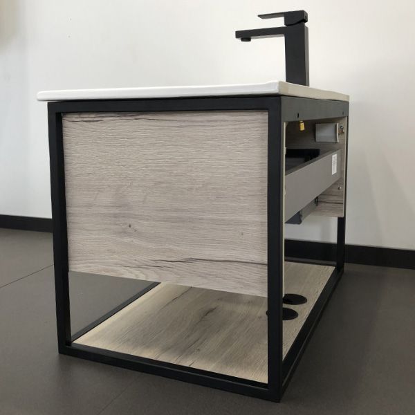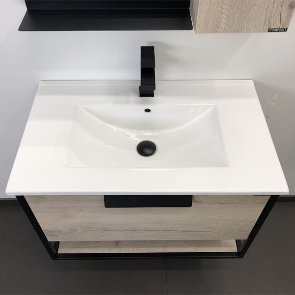Подвесная тумба-умывальник с одним выкатным ящиком оснащенным системой плавного закрывания и нижней полкой открытого хранения. В основе тумбы - каркас из стального профиля окрашенный черной матовой эмалью. Тумба в цвете дуб темный комплектуется черной матовой керамической раковиной Comforty 75E, тумба в цвете дуб дымчатый - белой глянцевой раковиной Comforty 75E из санфарфора.