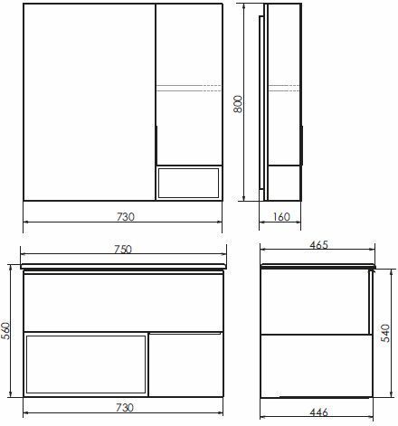 Подвесная тумба с двумя ящиками оборудованными системой плавного закрывания и пространством для открытого хранения. На ящиках тумбы черные матовые алюминиевые ручки.