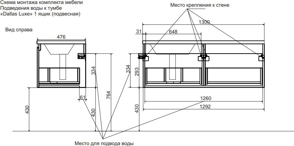 Тумба подвесная с раковиной-столешницей Эстет Dallas Luxe 130 см R, 1 ящик ФР-00002275