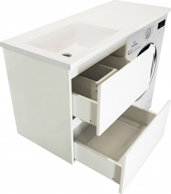 - Стиральная машина устанавливается под столешницей, за счет чего экономит место в ванной комнате.