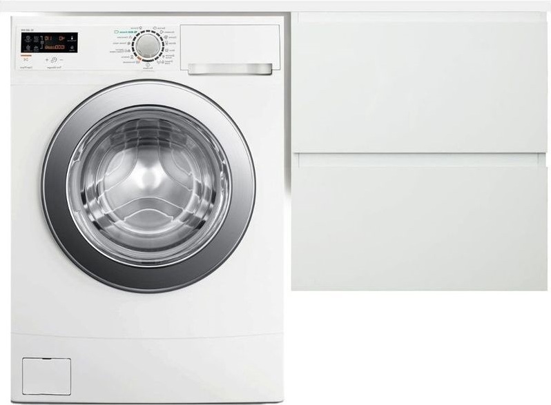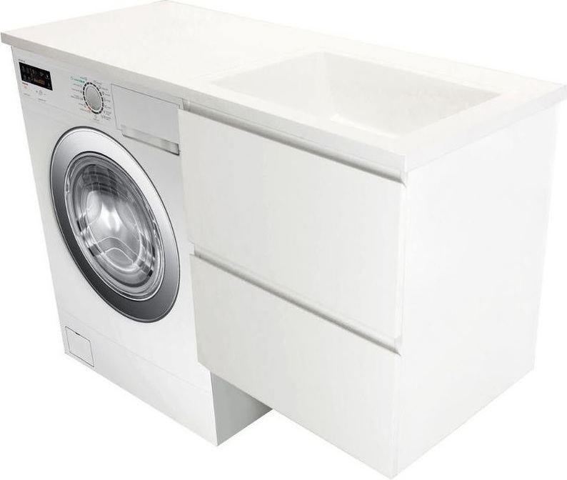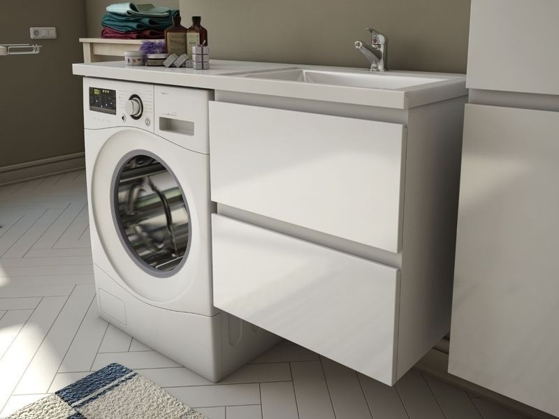 - Стиральная машина устанавливается под столешницей, за счет чего экономится место в ванной комнате.