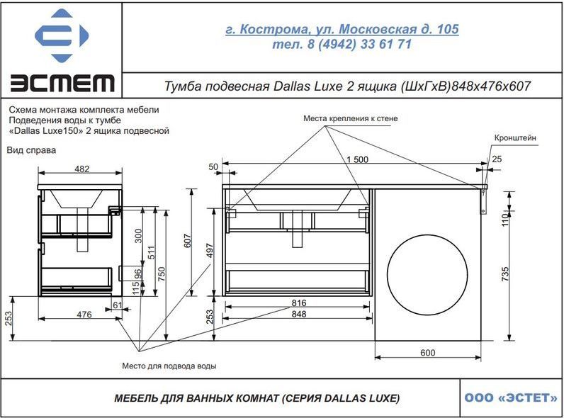 Тумба подвесная с раковиной-столешницей Эстет Dallas Luxe 150 см (2 ящика) R ФР-00009842