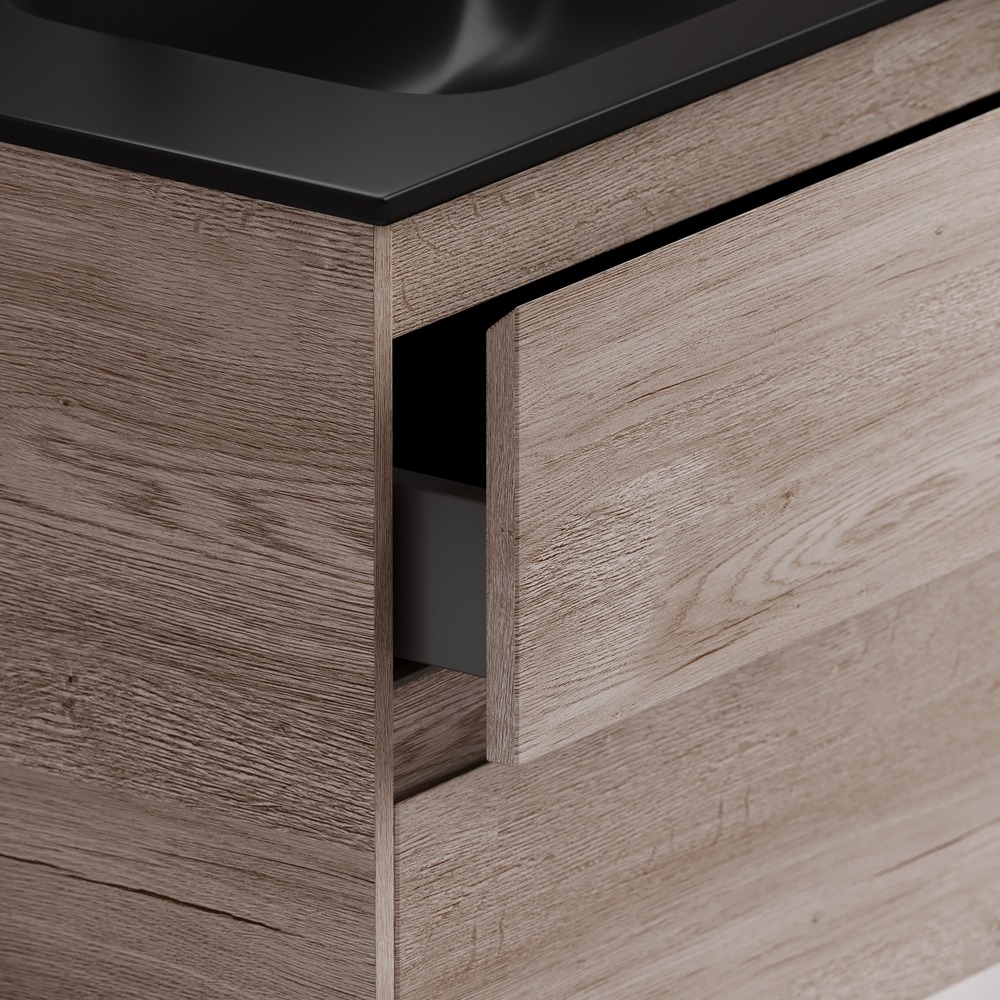 - Тумба подвесная Libra c двумя ящиками оснащенными доводчиками скрытого монтажа с системой плавного закрывания и с ручкой по всей длине ящика. Каркас и фасад тумбы выполнен из ЛДСП в цвете «дуб галифакс натуральный». Покрытие - ламинат.