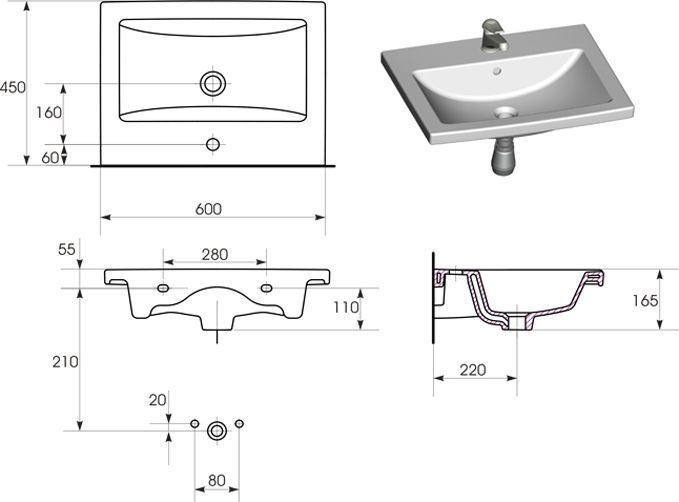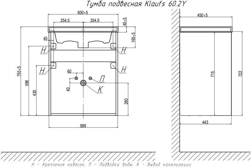 - Размер тумбы с раковиной: 600±5х450±5х755±5 мм (раковина Como 60)