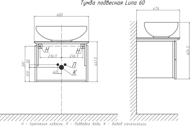Тумба подвесная с раковиной Velvex Luna 60 см tpLUN.60-21.43, белый