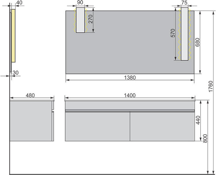 Данный комплект мебели состоит из тумбы с раковиной и зеркала. Ширина комплекта 140 см. Хорошо будет смотреться в интерьерах модерна: минимализм, лофт, хай-тек.