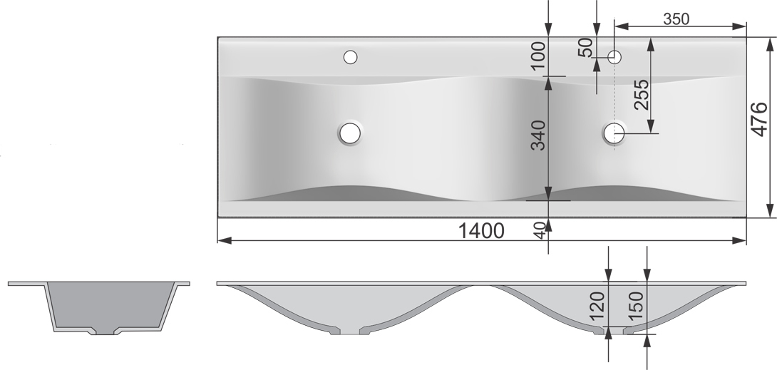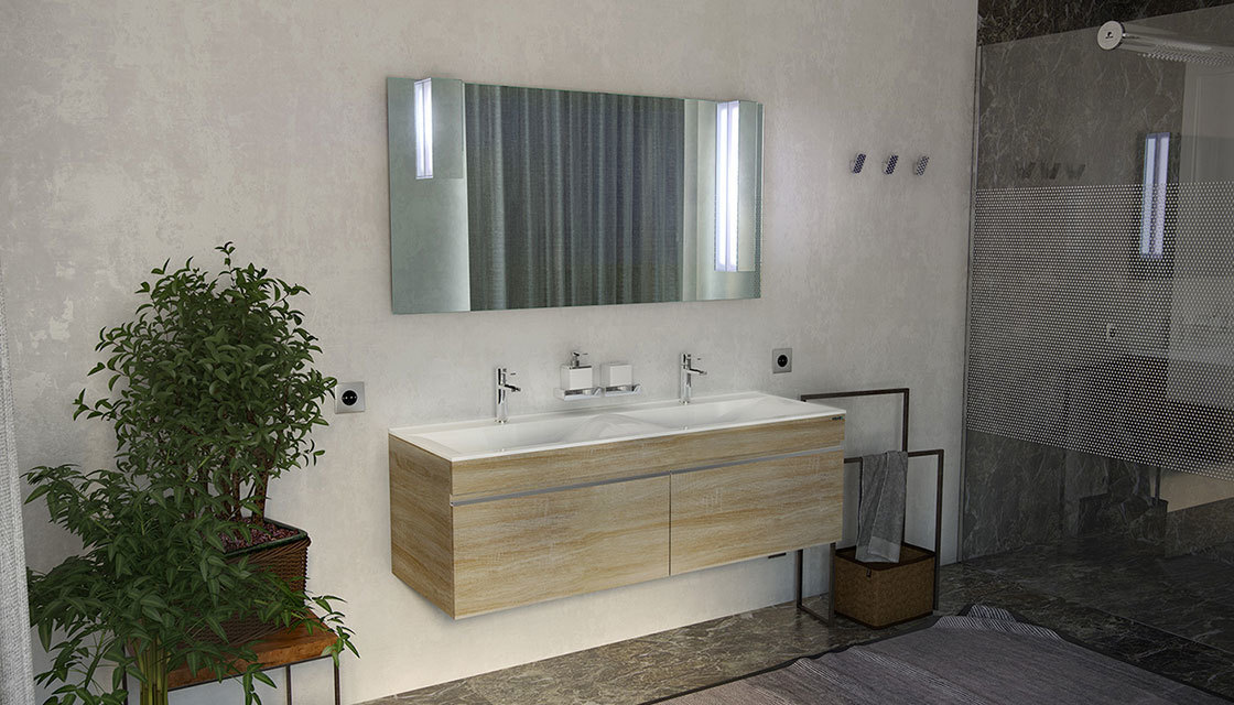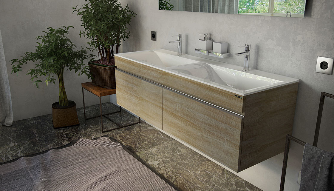 Комплект выполнен в лаконичности модерна. Основной акцент на двойной мойке с линиями мягких ритмичных волн. Зеркало, тумба, светильники, общая форма мойки – прямоугольники различных фактур. Декор, имитирующий простоту естественного дерева актуален для современного модерна. Простота форм, естественность фактур, мягкость ритмичных линий относит зрителя к чему-то первозданно-фундаментальному. С ритма, пульсации начинается жизнь. Она в дыхании, биении сердца, звуке, движении воды, планет, образовании кристаллов и человеческого тела. Респектабельность тут выражена не в сложности орнаментов или поверхностей, а в концептуальности восприятия мира. Мойка двойная, что дополняет идею пульсации между двумя людьми, одновременно ухаживающими за своим телом.