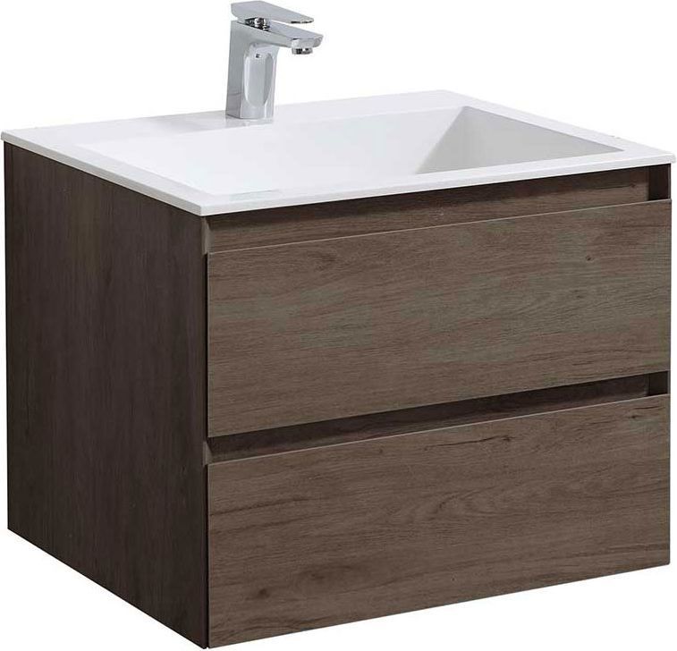 Тумба подвесная Vincea Luka 60 см с раковиной из искусственного камня VCB-13600W, система хранения: 2 выкатных ящика с доводчиками, цвет - тёмный дуб.