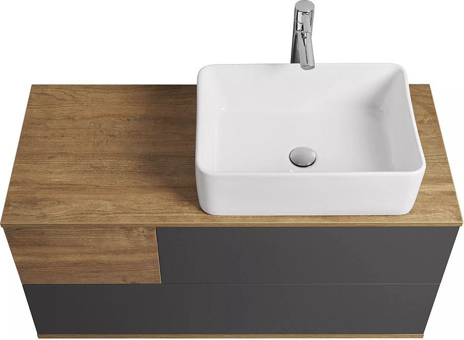 - Фасады ящиков - матовая серая пленка антрацит, а столешница, корпус и вставка на верхнем ящике - влагостойкое ДСП с текстурой дуб кантри