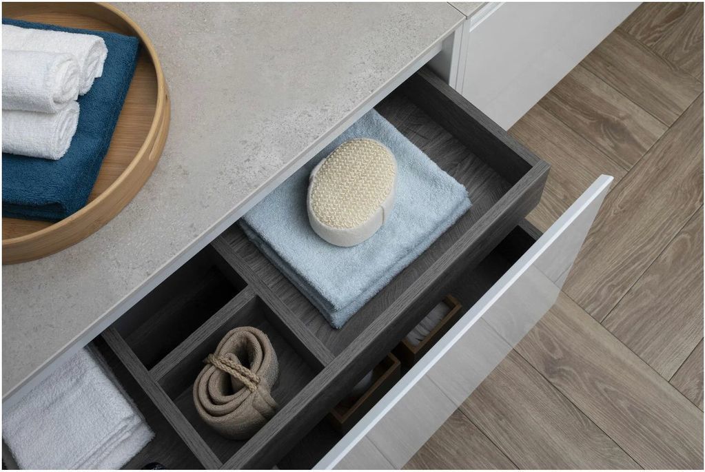 Тумба под раковину Aquanet Nova Lite 100 белоснежного цвета из влагостойкой ламинированной древесно-стружечной плиты выглядит нарядно. Подвесной монтаж придает визуальную легкость тумбе шириной 100 см. Тумба оборудована одним большим ящиком, внутри которого предусмотрен маленький с выемкой для установки сифона и разделителями, где удобно хранить необходимые в ванной комнате мелочи. Фасады выполнены с декоративной интегрированной ручкой, не имеющей острых краев и внутренних углов, что обеспечивает удобство в эксплуатации и легкий уход за мебелью. Ящики комплектуются направляющими немецкого производства Hettich Quadro, оснащенными доводчиками. Для комплектации тумбы можно выбрать: либо неглубокую стильную встраиваемую керамическую раковину «Латина», либо столешницу, в которой уже предусмотрено отверстие для установки накладной раковины.