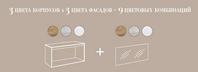- существует возможность комбинировать фасады и корпуса трех цветов: бетон светлый, дуб балтийский и белый глянец