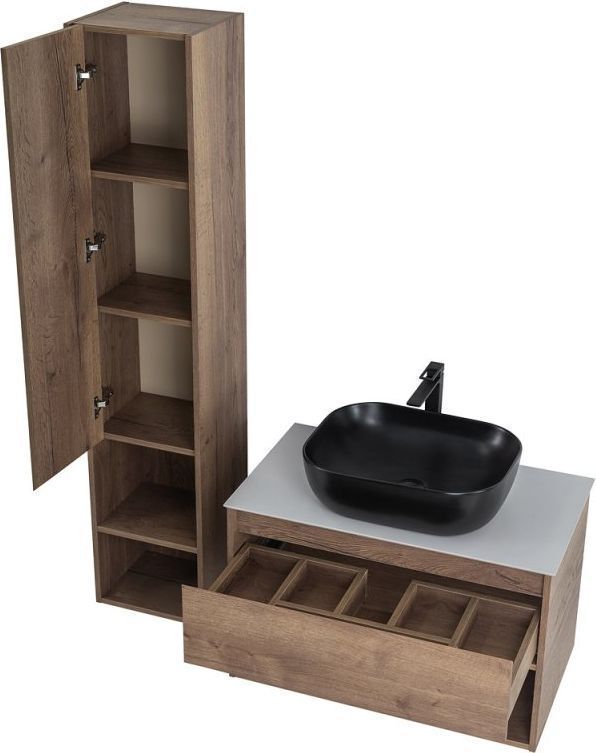 - Система хранения: 1 выдвижной ящик с врезной (фрезерованной) ручкой в плоскости фасада и открытая полка