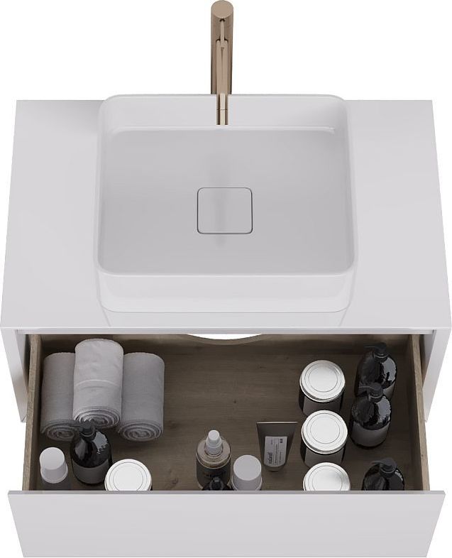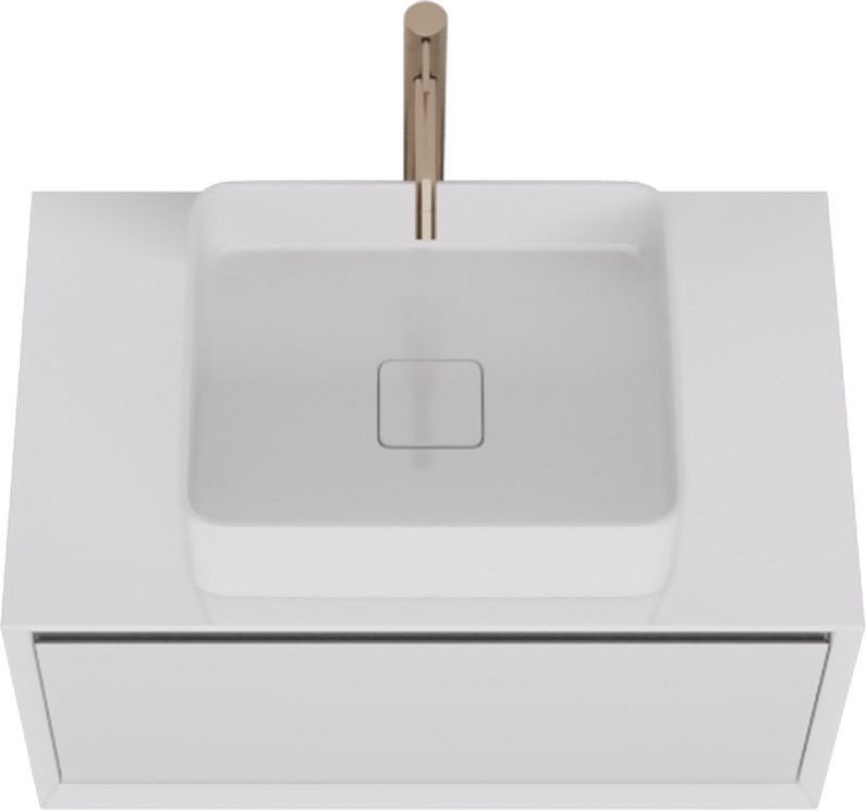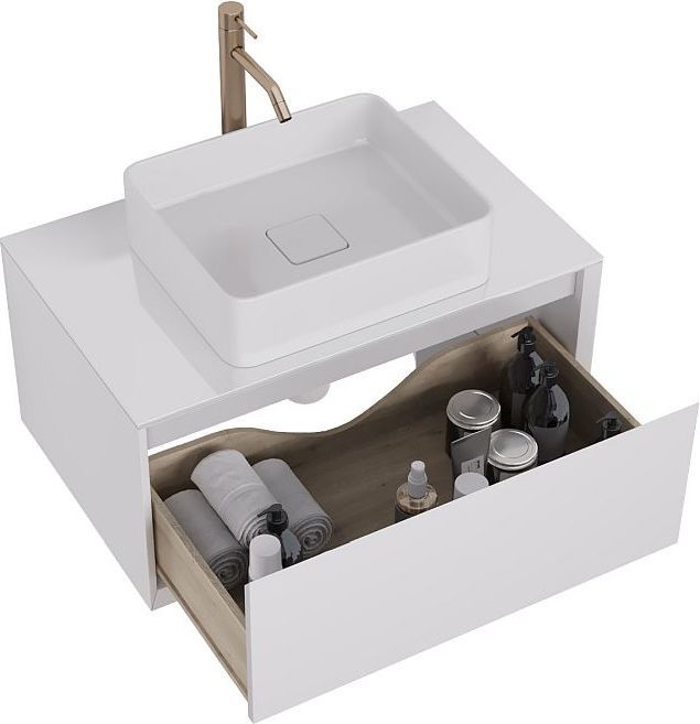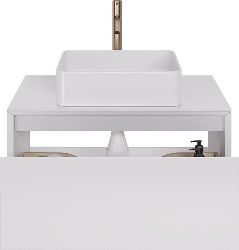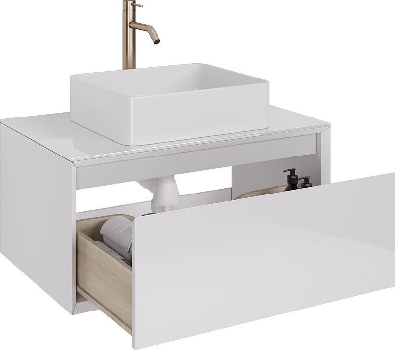 Тумба подвесная Dreja Insight 80 см 99.9200 со стеклянной столешницей с отверстиями для умывальника и смесителя, 1 ящик, цвет белый глянец. Раковина приобретается отдельно.