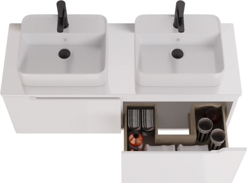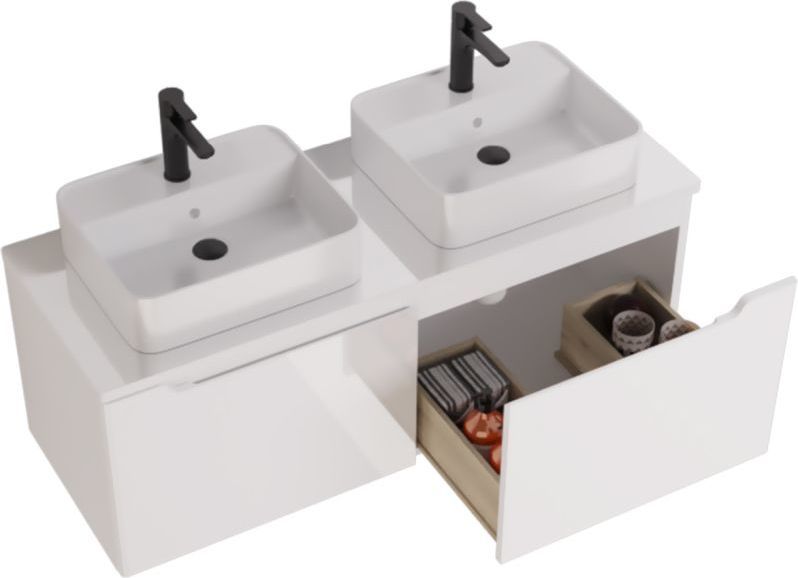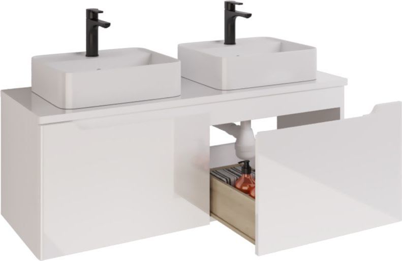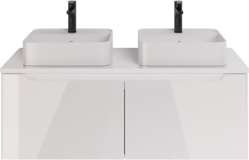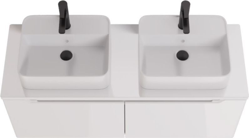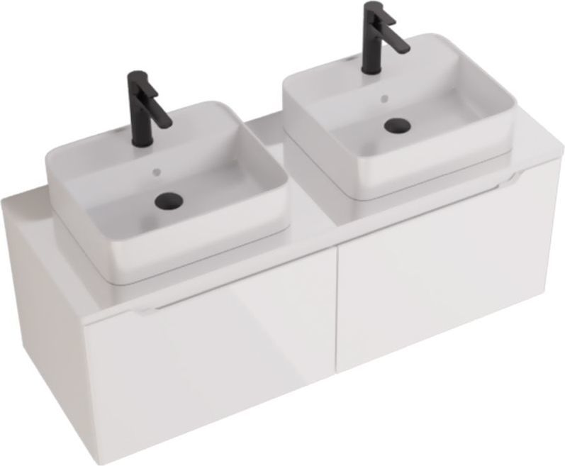 Тумба подвесная Dreja W 125 см 99.9400 со стеклянной столешницей W 99.9401 с отверстиями для установки 2-х накладных умывальников, 2 ящика, цвет белый глянец. Раковины приобретается отдельно.