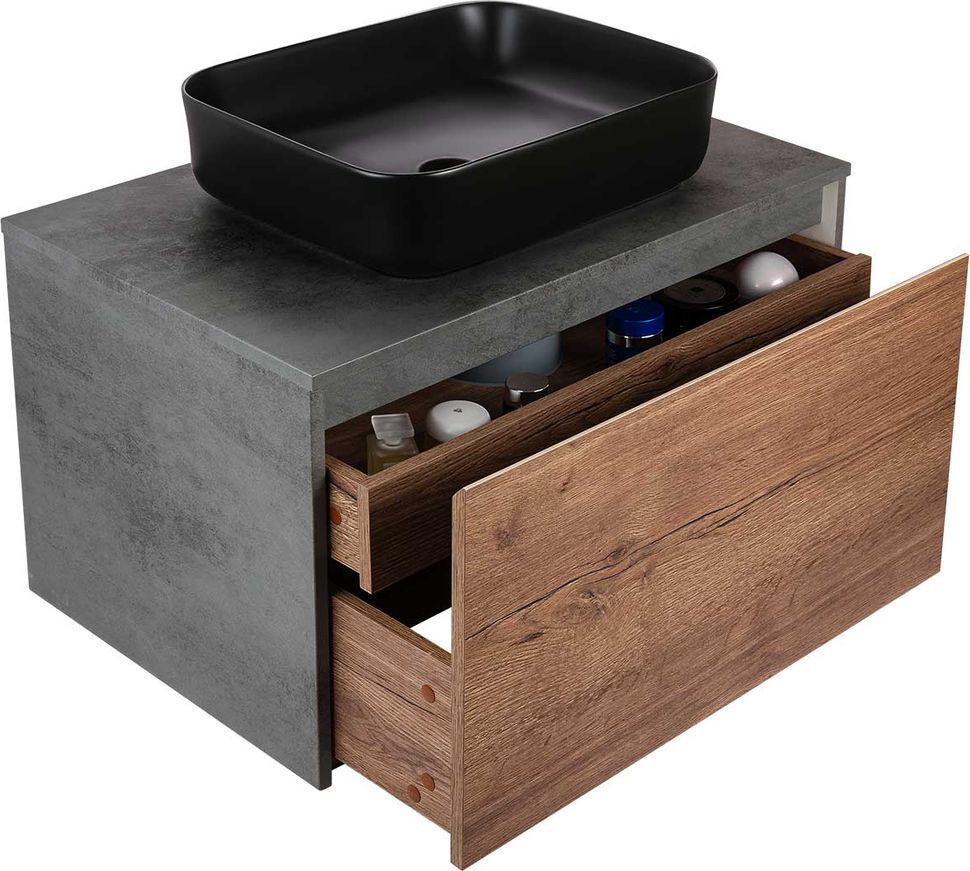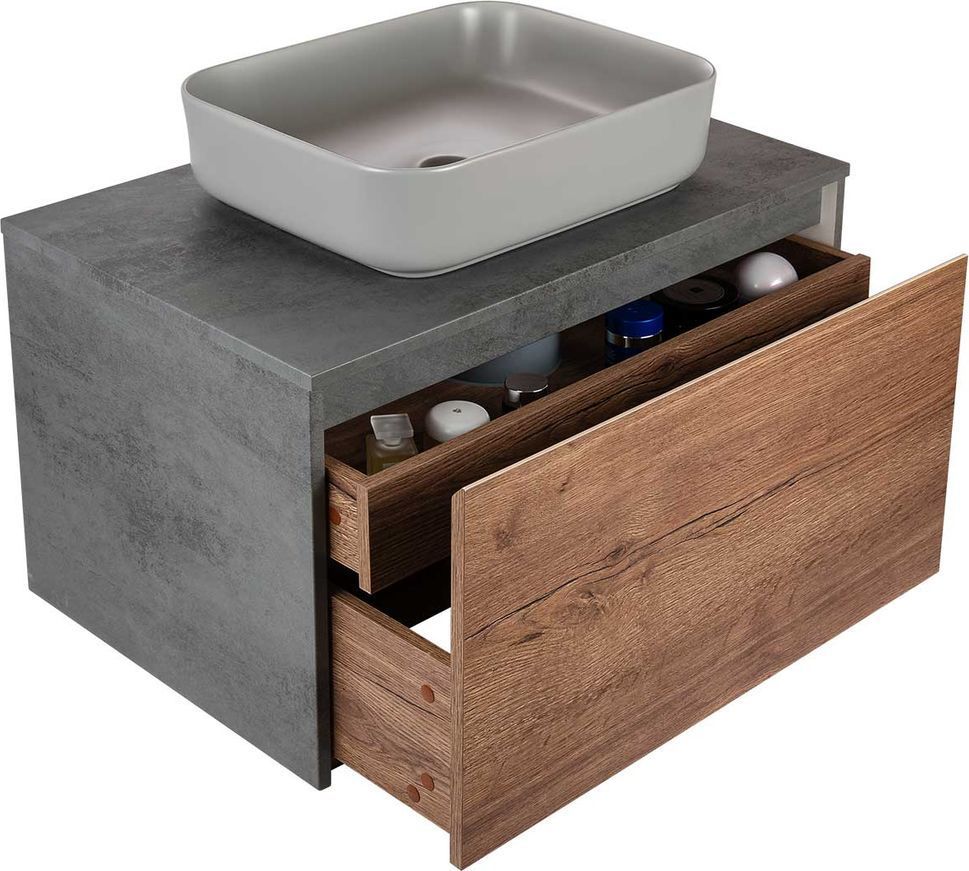 Тумба подвесная со столешницей Vincea Mesa 80 см, система хранения: 2 выкатных ящика с доводчиками (один большой и внутренний органайзер), цвет - бетон/дуб табак.