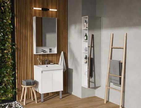 Тумба Сканди Doors 55 выполнена в популярном минималистичном скандинавском стиле. Корпус тумбы выполнен из влагостойкой ЛДСП в декоре натурального дерева, а фасады-створки в белой глянцевой покраске. За створками скрывается вместительное пространство, разделенное на две части регулируемой по высоте полкой из ВЛДСП. На тумбе нет выступающих деталей и фурнитуры, открытие створок реализуется за фасад, верхняя часть которого обработана под ручку J-профиль.