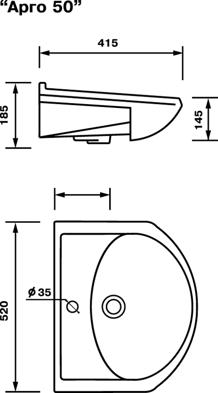 Умывальник Оскольская керамика Арго 50, размер 520x415 мм, материал - санфарфор, комбинируется с тумбой под умывальник.