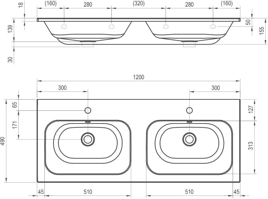 Умывальник сдвоенный Ravak CHROME SLIM 1200, размер 1200х490 мм, материал - литой мрамор, цвет - белый.