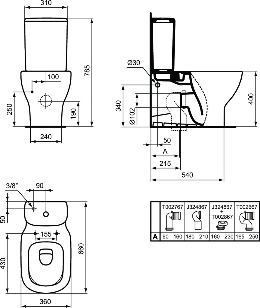 Унитаз-компакт безободковый Ideal Standard Tesi AquaBlade T008201, бачок с нижним подводом T356801 и крепежем, цвет - белый. Сиденье с крышкой приобретается отдельно.