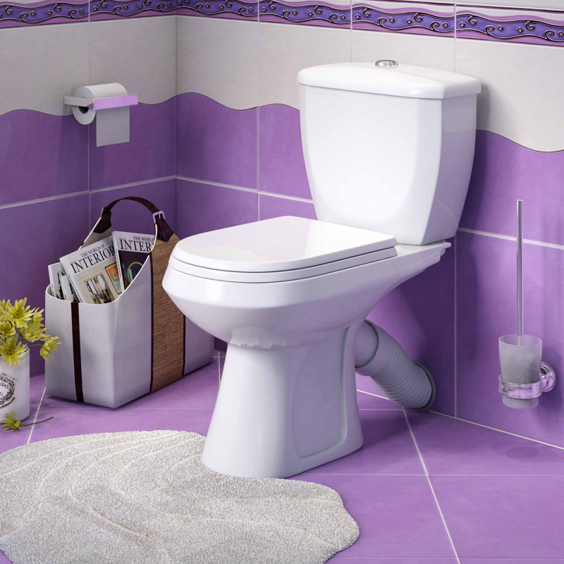 Унитаз-компакт Оскольская керамика Элисса Комфорт, с системой антивсплеск, одна кнопка, полный слив 6 л, косой выпуск, сиденье с полипропиленовой крышкой с микролифтом.