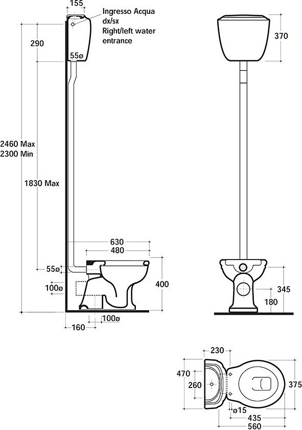 Унитаз-компакт слив горизонтальный Globo Paestum PA002.BI, высокая труба BA005cr с механизмом слива BA003cr, бачок подвесной PA010.BI, цвет белый, фурнитура хром. Сиденье с крышкой для унитаза приобретается отдельно.