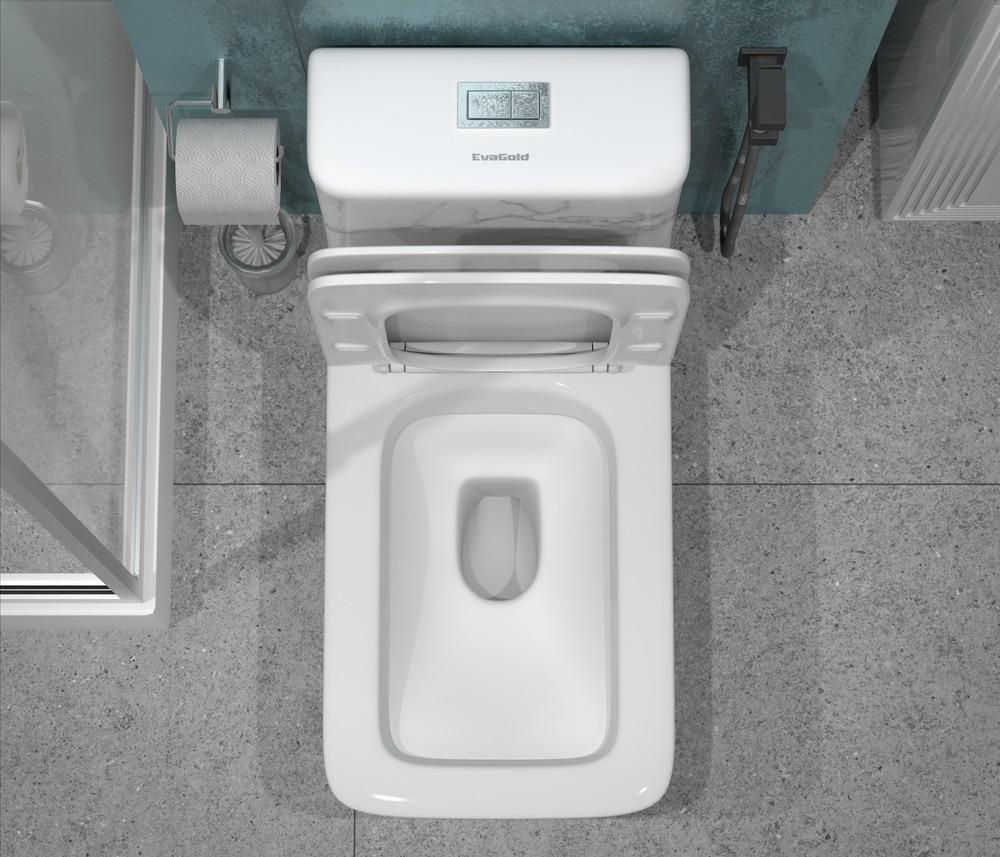 Унитаз-моноблок безободковый EvaGold EG060002, каскадный слив, 2 режима смыва воды, сиденье с тонкой крышкой микролифт, цвет белый с декором.