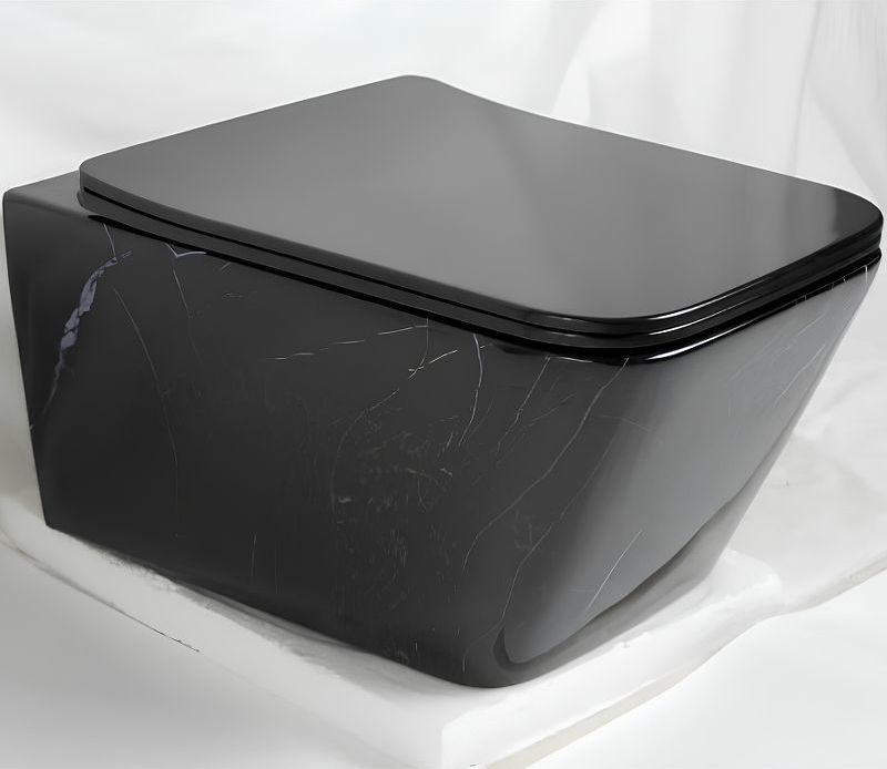 Унитаз подвесной безободковый CeramaLux 2215BW с тонкой крышкой микролифт, чёрный мрамор