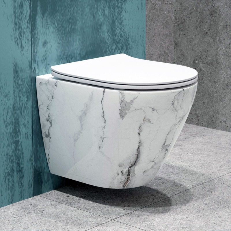 Унитаз подвесной безободковый EvaGold EG070017 с тонкой крышкой микролифт, белый мрамор
