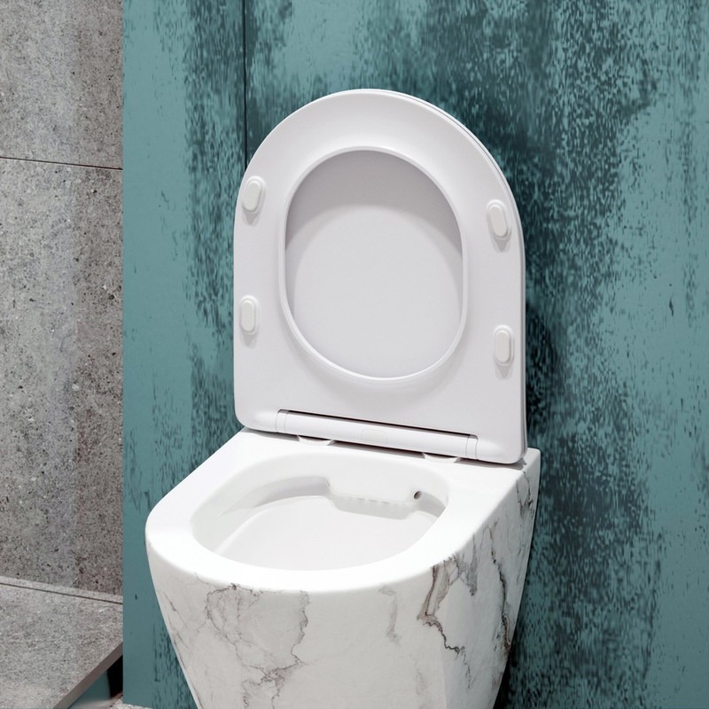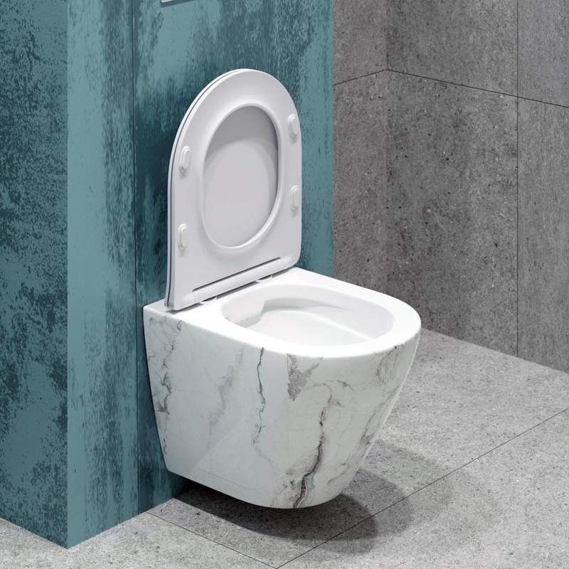 Унитаз подвесной безободковый EvaGold EG070017, каскадный слив, сиденье с тонкой крышкой микролифт, цвет белый мрамор.