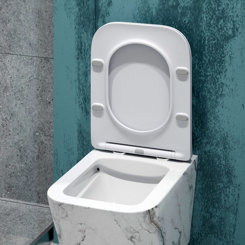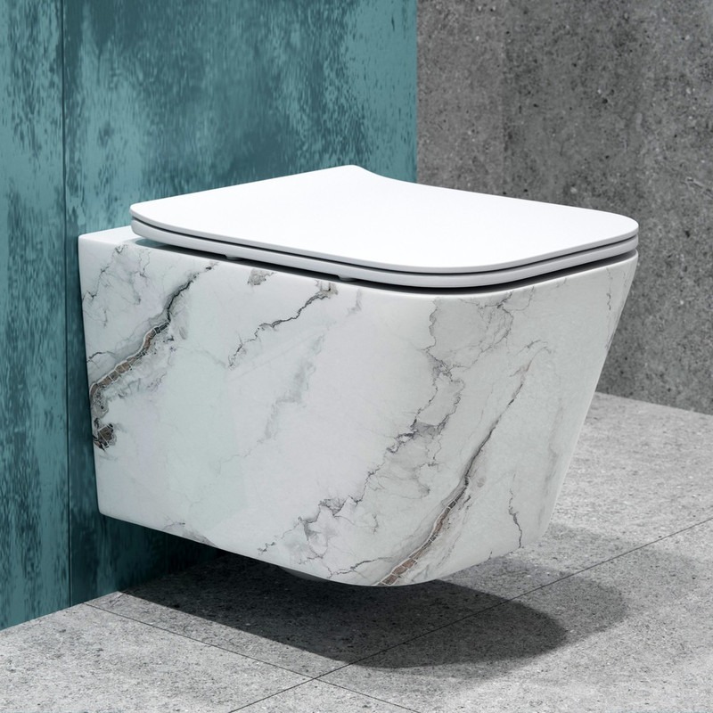 Унитаз подвесной безободковый EvaGold EG070018 с тонкой крышкой микролифт, белый мрамор