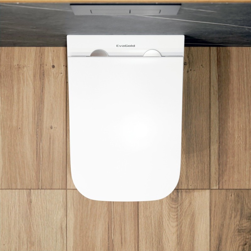 Унитаз подвесной безободковый EvaGold EG070043, каскадный слив, сиденье с тонкой крышкой микролифт, цвет белый.