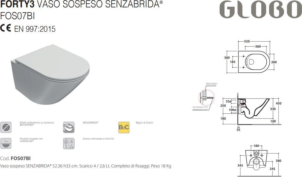 Характеристики унитаз безободковый,унитаз подвесной Globo (FOS07.BI)