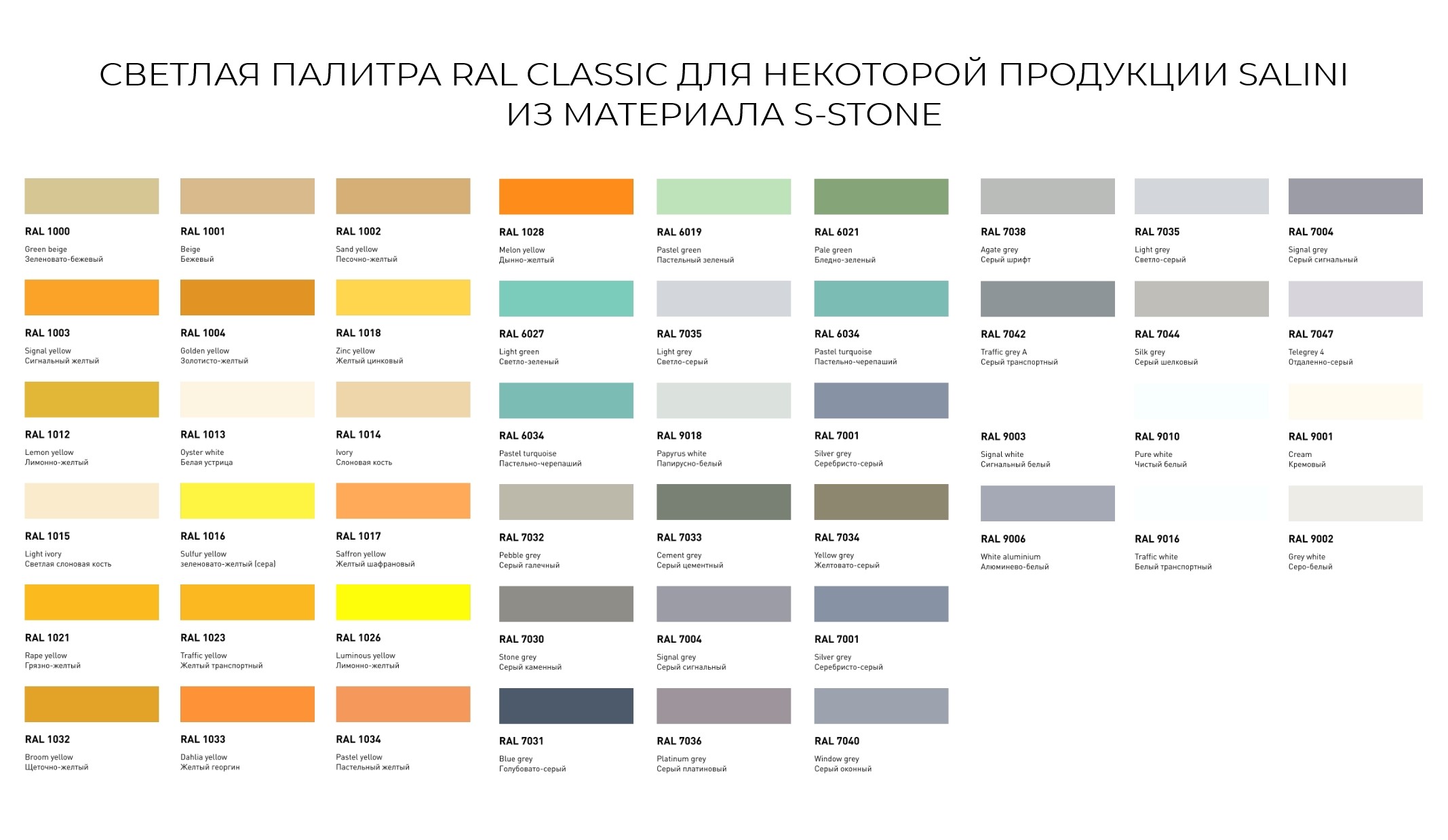 - Внимание! Унитазы и биде Gemelli из материала S-Stone могут быть изготовлены только в светлых оттенках палитры RAL Classic. (палитра приложена в изображениях).