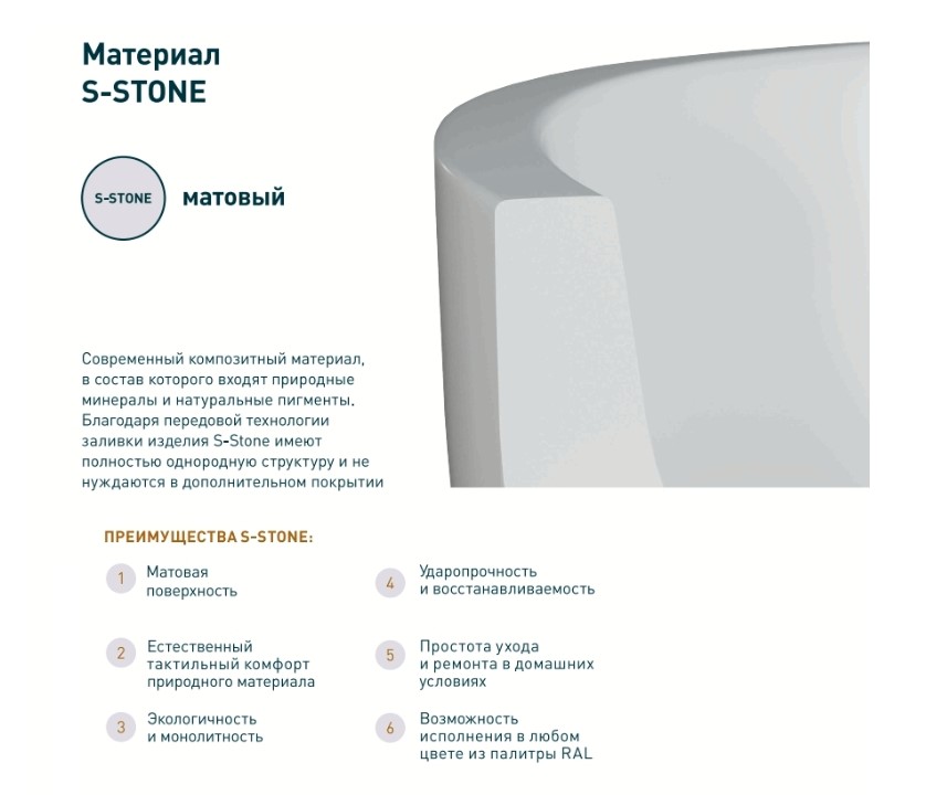 S-Stone – современный композитный материал, в состав которого входят природные минералы и натуральные пигменты, смешанные со смолами на базе ISO/NPG. Благодаря передовой технологии заливки, изделия из материала S-Stone имеют однородную структуру и не нуждаются в дополнительном покрытии.