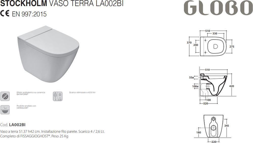 Унитаз приставной Globo Stockholm LA002.BI, цвет белый. Сиденье с крышкой для унитаза приобретается отдельно.