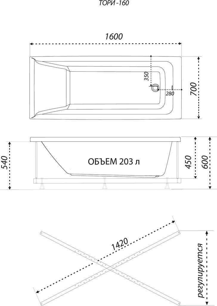 Ванна акриловая 1ACReal Тори с каркасом, размер 1600х700 мм, сифон приобретаются отдельно, цвет белый.