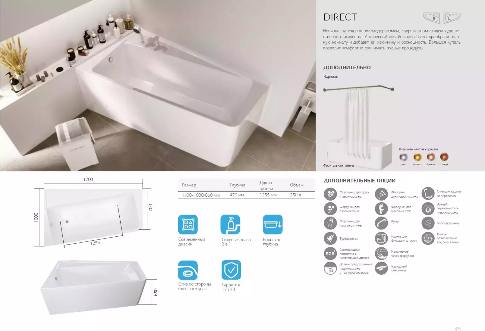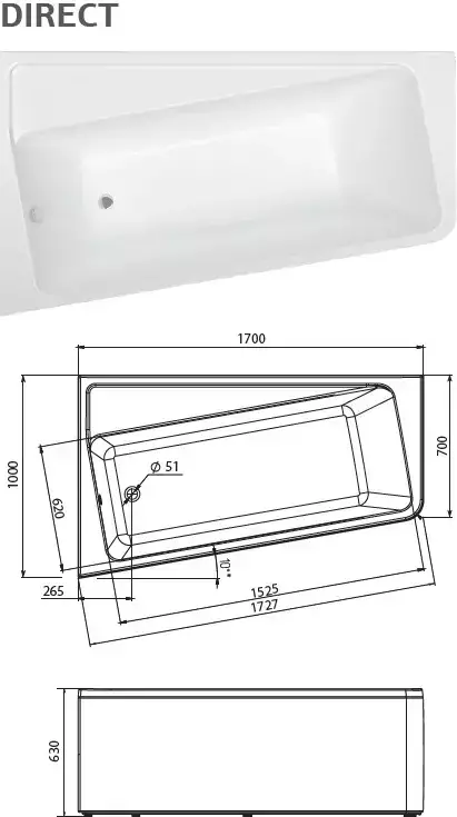 Ванна акриловая 1Marka Direct, размер 1700x1000 см, цвет белый. Каркас, панель и сифон приобретаются отдельно.