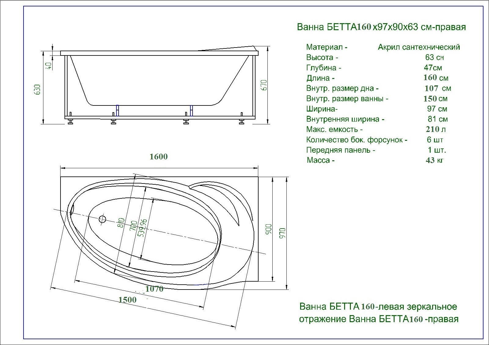 Ванна акриловая Aquatek Бетта L 160x97 см BET160-0000055, Размер - мм: 1600х1000 - фото